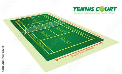 An illustration of tennis court layout based on International Tennis Federation (ITF) specifications. This diagram showcases the exact measurements of key court components such as the net height