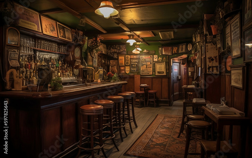 interior, cosy, inviting, window, entrance door, ivy, drink, conversation, bar, tap, beer, spirit, barkeeper, furnishing, traditional, fireplace, generative, ai
