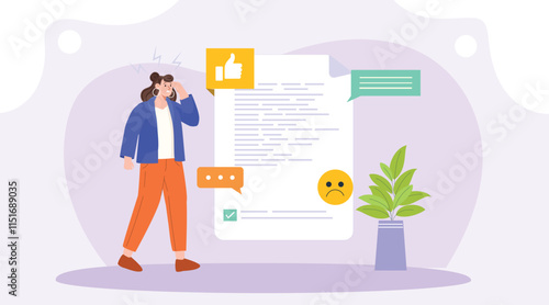 An illustration showcasing customer feedback with a review of a complaint, featuring a user submitting feedback on a digital platform, with visual elements of stars, ratings.