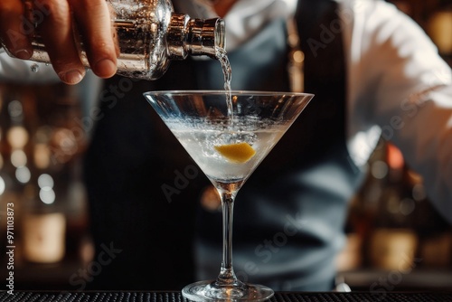 An image captures a bartender making a cocktail and adding a lemon decoration to a martini glass, highlighting the attention to detail and elegance in cocktail preparation in a bar setting.