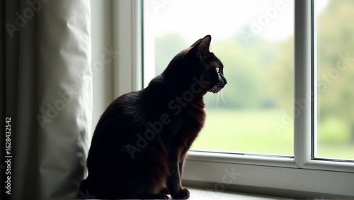 An image of a black cat sitting in a window, looking out at the world, with a contemplative or curious expression.