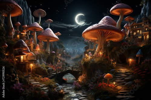 An image of a fantastical garden where oversized, luminescent mushrooms cast a soft glow on the surrounding flowers, creating an enchanting and whimsical scene. Generative Ai.