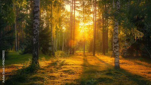an image of a forest clearing bathed in the golden light of sunset