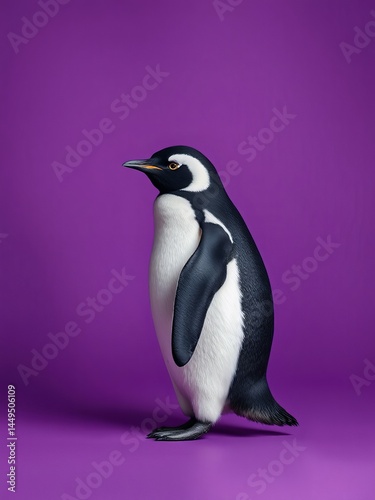 an image of a penguin standing on its hind legs on a purple background, there is a penguin standing on its hind legs on a purple background