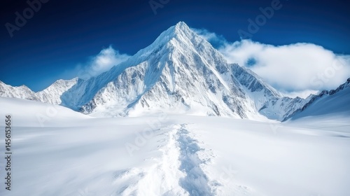 An imposing mountain landscape adorned in snow showcases the grandeur of nature, creating an awe-inspiring scene that invites adventure and exploration in a winter wonderland.