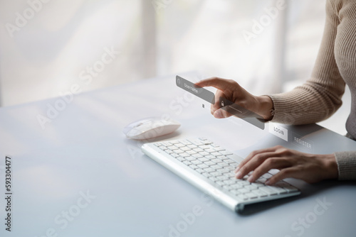An individual is typing on a laptop keyboard showing a hologram interface to a member login, a businessman is going to access the company's membership system, check the information of the parties.