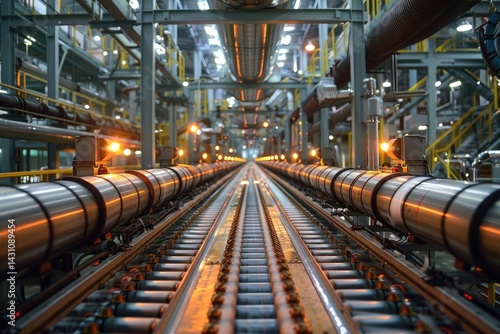 metal, steel, pipe, conveyer, industrial, factory, manufacturing, machinery, structure, construction, engineering, processing, facility, system, equipment, transport, production, line, chain, roller, track, rail, grooved, light, illumination, interior, building, plant, warehouse, perspective, long, distance, direction, symmetric, parallel, automation, industry, technology, bright, shiny, metallic, chrome, tubular, pipeline, assembly, energy, process, modern