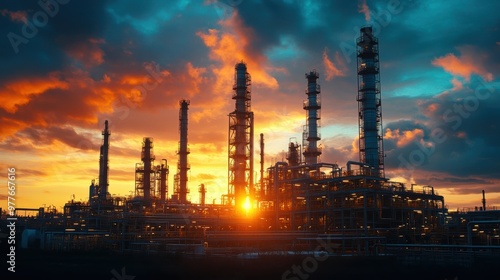 An industrial landscape showcasing a refinery silhouette against a stunning sunset, highlighting the beauty of technology and nature.