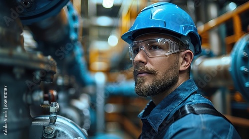 An industrial worker, clad in blue safety gear, poses in a factory environment surrounded by machinery, highlighting safety, precision, and industrial expertise in a dynamic setting.