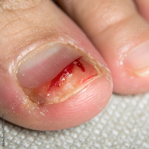 An infected big toenail with inflammation, redness, and minor bleeding on the cuticle area
