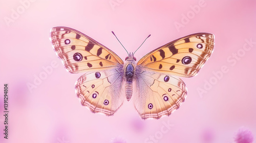 insect, butterfly, wing, pattern, colours, nature, beauty, flight, delicate, detail, macro, close, up, vibrant, texture, surface, design, spot, circle, antennae, body, segment, symmetry, pale, orange, cream, yellow, black, pink, soft, dreamy, blurred, background, aethereal, elegance, graceful, life, fauna, wildlife, lepidoptera, garden, floral, pollination, summer, springtime, animal, portrait