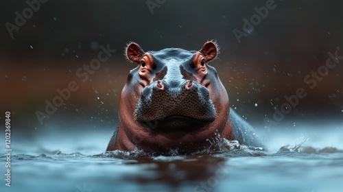 An intense capture of a hippo's face rising from tranquil waters, with droplets of water splashing playfully, showcasing the beauty of these magnificent creatures in nature.