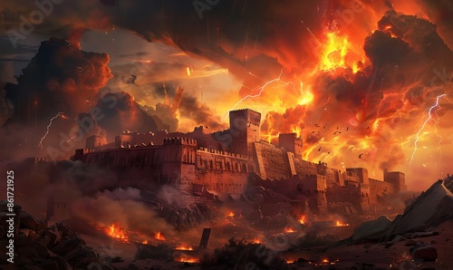 An intense, dramatic scene with Jericho's walls collapsing under a stormy, fire-lit sky, emphasizing the chaos and destruction