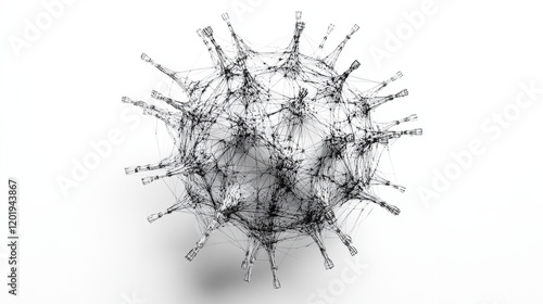 An intricate 3D wireframe model of a virus, monochromatic minimalism, modern scientific illustration, isolated on white background