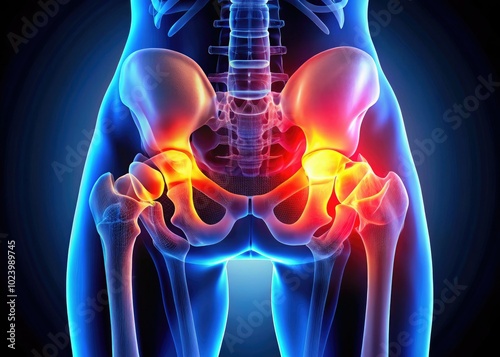 An intricate 3D X-ray of the painful hip joint, accentuating the joint's structure and anatomy, offers valuable insights for understanding hip-related pain.