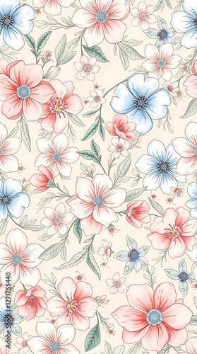 An intricate floral seamless pattern in watercolor style, showcasing soft pastel pinks, blues, and greens, with delicate line work and a slightly faded aesthetic, ideal for .