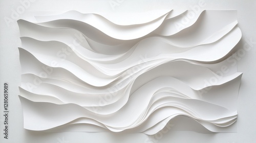 An intricate, textured white paper art piece featuring flowing waves and curves, evoking a serene and modern aesthetic.