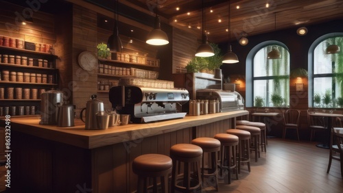 An inviting interior of a coffee shop, featuring warm wooden furnishings, shelves filled with coffee beans and vintage coffee-making equipment, dim, soft lighting, and a variety of potted plants addin