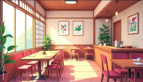 room, interior, table, chair, plant, window, sunlight, artwork, painting, eatery, cafes, dining, wooden, frame, light, bright, shadow, floor, pot, green, leaf, flower, picture, decor, peaceful, space, elegant, minimalist, simple, empty, afternoon, clean, calm, wall, modern, natural, counter, teapot, utensil, bowl, paper, serene, inviting, arrangement, square, aesthetic