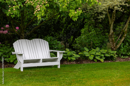 An Isolated View of English Style Garden Path with Manicured Lawn, Hostas, Trees, and White Adirondack Garden Bench - Daytime, No Sky