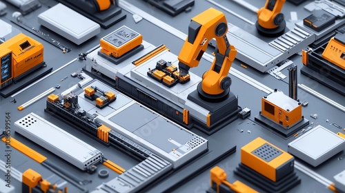 An isometric illustration of a robotic arm moving objects on a conveyor belt in a factory.