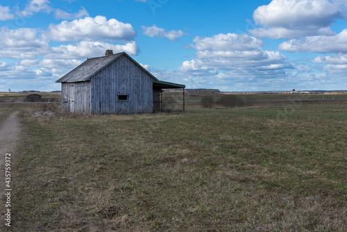 An old abandoned small wooden house in the fields sky clouds, barn or scary concept.