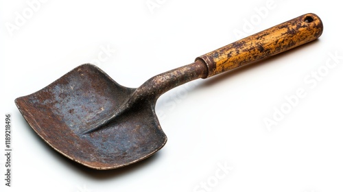 an old and rusty metal hand shovel with a wooden handle on a white background