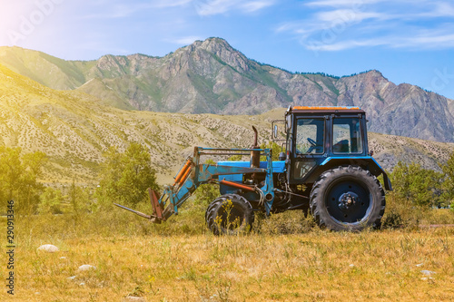 An old blue tractor excavator stands in a field with green and yellow grass against a background of mountains and blue sky during harvesting in summer or autumn. Agriculture and farming machinery.