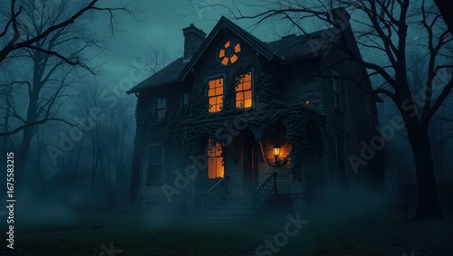 An old haunted house in the dark forest with fog and spooky atmosphere