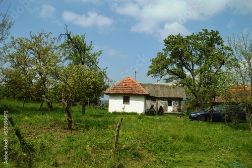 house, grass, home, sky, architecture, building, landscape, rural, old, tree, village, nature, blue, roof, traditional, window