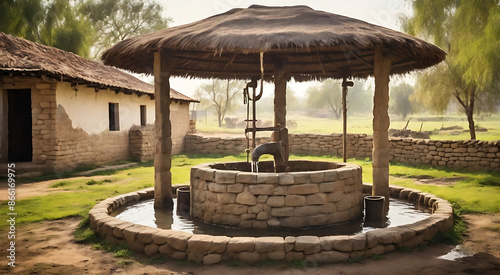 An old Traditional vintage stone or cement water well of cattle filled with water, circular water well