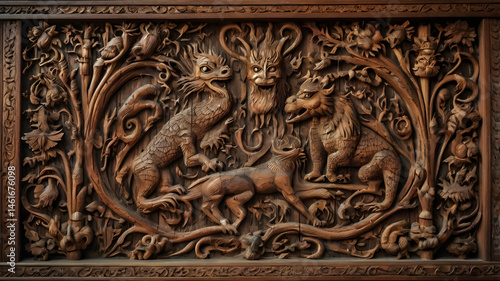 An old wooden wall with hand-carved patterns of mythical creatures, full of intricate details.