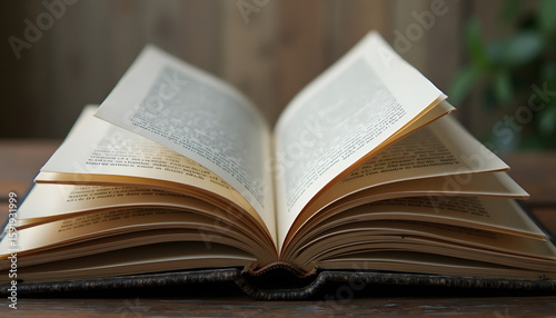 An open book rests on a wooden surface, pages fanned out, suggesting reading, knowledge, or storytelling.