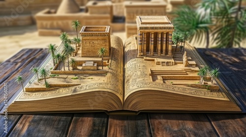 An open book with 3D graphics of Luxor Temple and the Valley of the Kings emerging in majestic form.