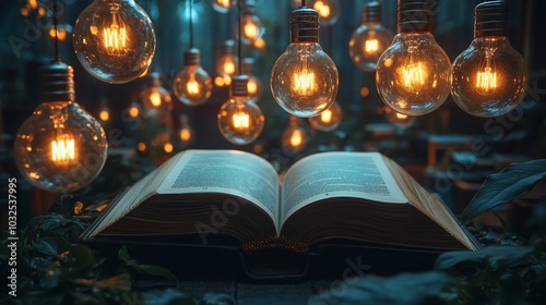 An open book with glowing lightbulbs hanging above it on a dark wooden table.