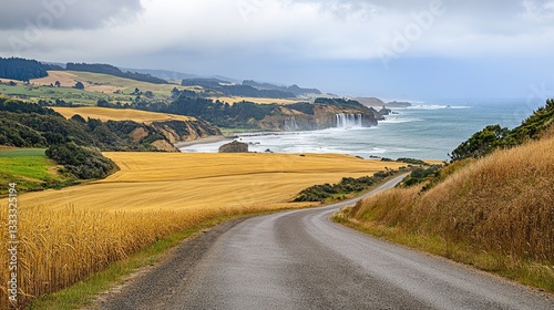 road, landscape, field, coast, ocean, water, sky, cloud, tree, hill, green, yellow, brown, grass, view, scenic, nature, horizon, distant, outdoors, summer, sunlight, travel, rural, agriculture, farm, curve, winding, path, pathway, daylight, coastline, cliff, waterfall, wave, stormy, dramatic, calm, country, open, empty, texture, detail, natural, environment, wide, perspective
