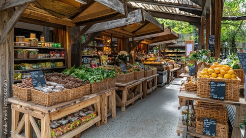 An organic food market with stalls made of reclaimed wood, and biodegradable packaging for products