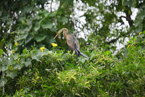 anhinga, water bird, slender, pointed bill, yellow flower, blossom, wildlife, avian, birding, nature, tree, tree branch, jungle, forest, tropical, ecosystem, wetland, aquatic, wing, graceful, elegant, tranquil, peaceful, serene, closeup, wild, animal, biodiversity, conservation