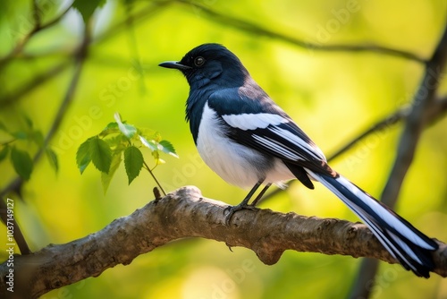 An oriental magpie robin perches gracefully on a branch surrounded by vibrant foliage capturing the beauty of morning sunlight filtering through the leaves