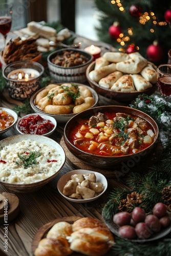 An Orthodox Christmas dinner with dishes like borscht, pierogi, and kutia. The table is beautifully set with festive