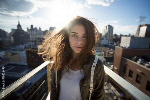 An overhead and close-up shot about a teenage girl standing on a rooftop and looking at the camera, with a beautiful view of cityscape in sunrise...