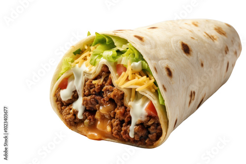 An overhead view of a burrito with a soft tortilla, stuffed with seasoned beef, shredded cheese, and lettuce, neatly placed on a plain white background.