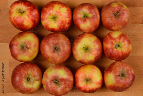 An overhead view of a grid of red and green apples, neatly arranged in rows on a wooden surface