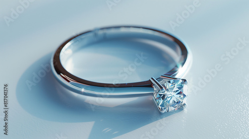 An ultrarealistic photograph of a white gold engagement ring with a round cut diamond, in a profile view on a clean background.