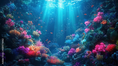 An underwater coral reef teeming with vibrant marine life illuminated by sunlight streaming through turquoise waters. Schools of fish swim through colorful coral formations, creating a lively