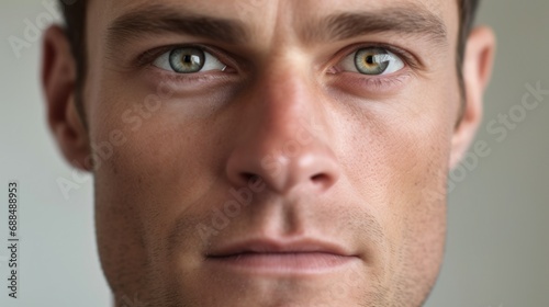 An up-close perspective of the man's eyes, conveying a powerful presence.