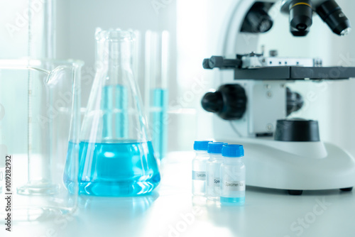 analyze biochemical samples in advanced scientific laboratory. Medical professional use microscope look microbiological developmental of viral. Biotechnology research in science lab.