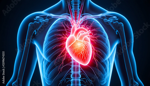 Anatomical Heart: Glowing, Red, and Surrounded by Blue Human Torso Silhouette.
