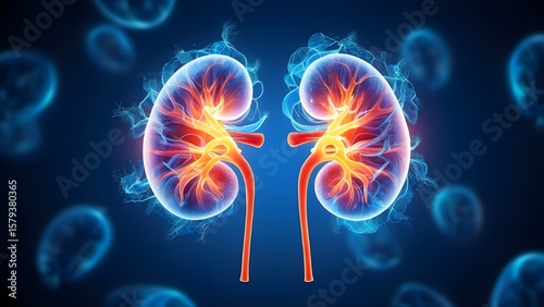 kidney, anatomy, anatomical, medicals, health, health care, organ, biology, biological, science, scientific, illustration, three-dimensional, rendering, glowing, luminescent, vibrant, blue, red, orange, energy, abstract, futuristic, digital artwork, body, physiology, system, filtration, excretion, wellness, disease, treatment, biotechnology, cellular, microscopic, organic, vital, life