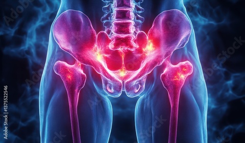 hip, pelvis, pain, inflammation, anatomy, joint, human, three-dimensional, illustration, medicals, scientific, visualisation, x-ray, bone, skeleton, health, injury, arthritis, muscle, sport, body, knee, spine, three-dimensional, glowing, red, blue, gradient, centered, composition, precision, detail, chronic, discomfort, diagnosis, treatment, structure, illustrative, design, render, digital, painful, visual, infographic, illustrator, anatomical, emphasis, sharpened